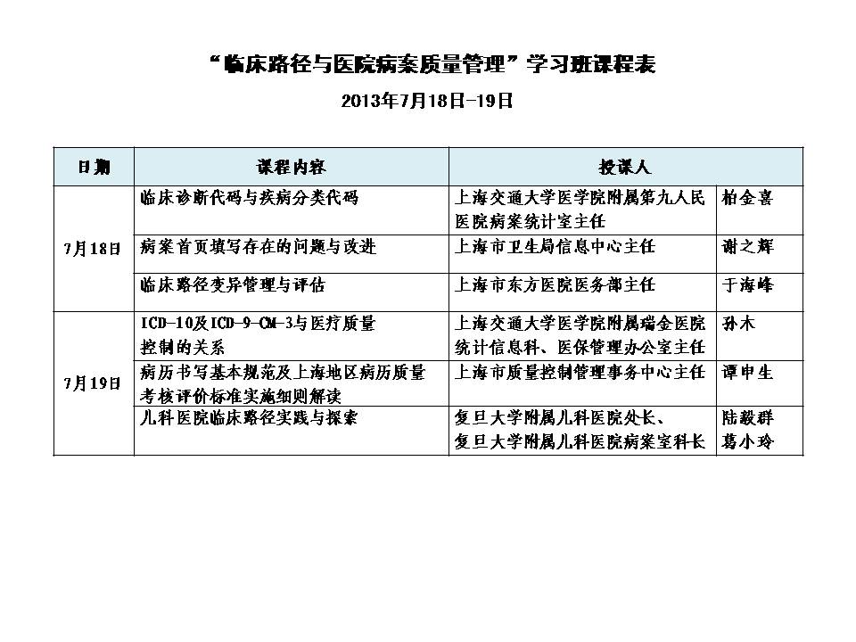 “臨床路徑與醫(yī)院病案質(zhì)量管理”學(xué)習(xí)班課程表(2013年7月)