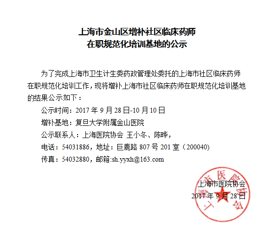 上海市金山區(qū)增補社區(qū)臨床藥師在職規(guī)范化培訓(xùn)基地的公示